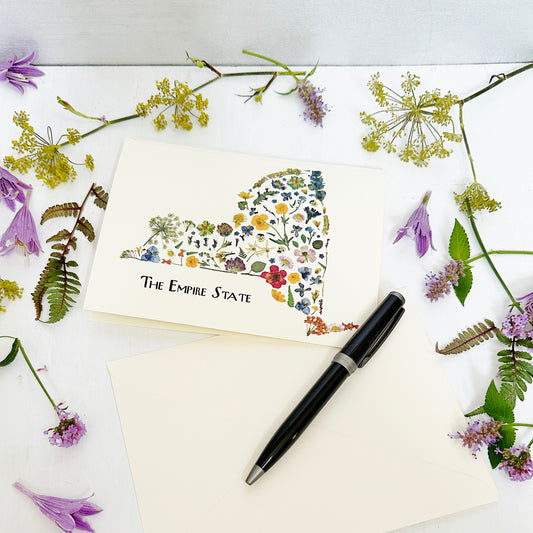 The Empire State greeting card - New York State map in printed pressed wild flowers