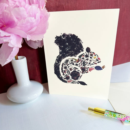Black Squirrel - Printed pressed flowers and leaves blank greeting card