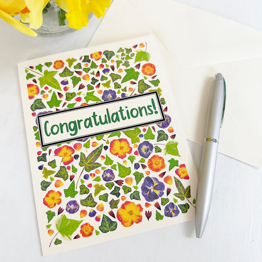 Congratulations card - Printed real pressed flowers and ivy leaves