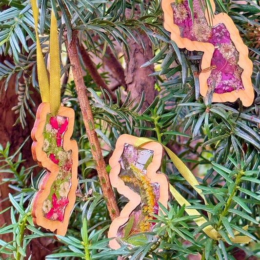 Christmas ornament in the shape of New Jersey filled with real flowers in resin