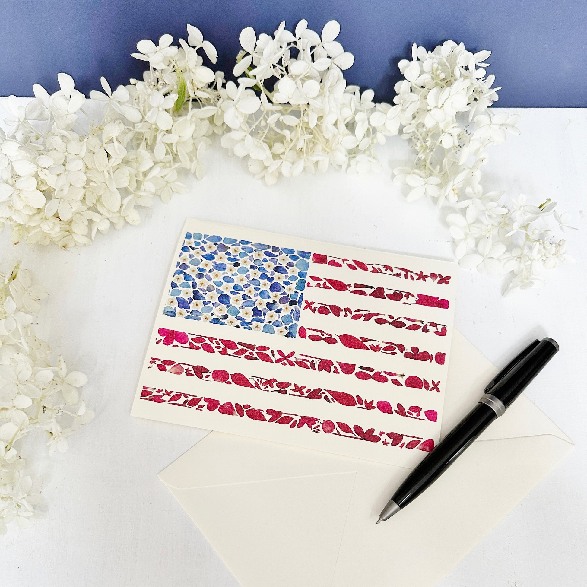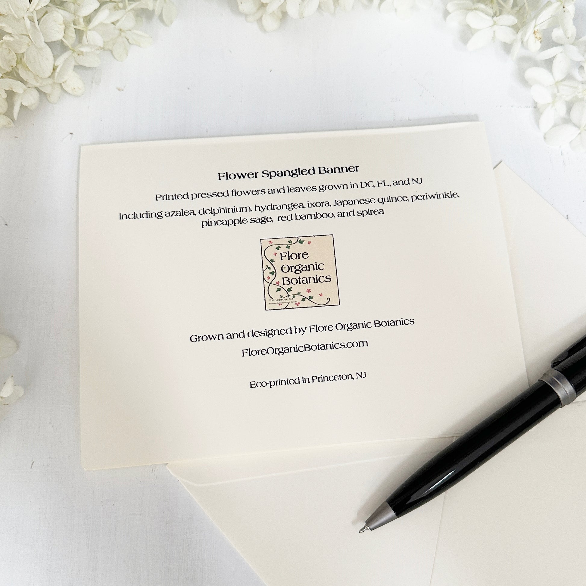 This greeting card is a print of the original collage "Flower Spangled Banner" representing the American flag made of real pressed flowers grown in DC, Florida, and NJ, including azalea, delphinium, hydrangea, ixora, Japanese quince, periwinkle, pineapple sage, red bamboo, and spirea. The original collage of the USA flag will be displayed at the exhibit "Botanical Princeton" in November 2024.