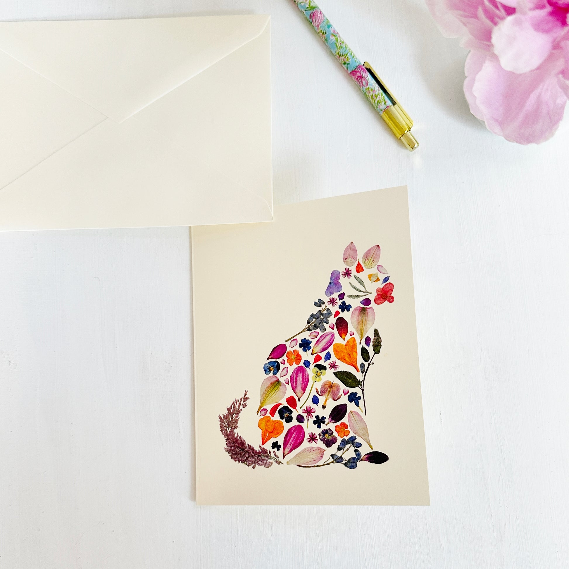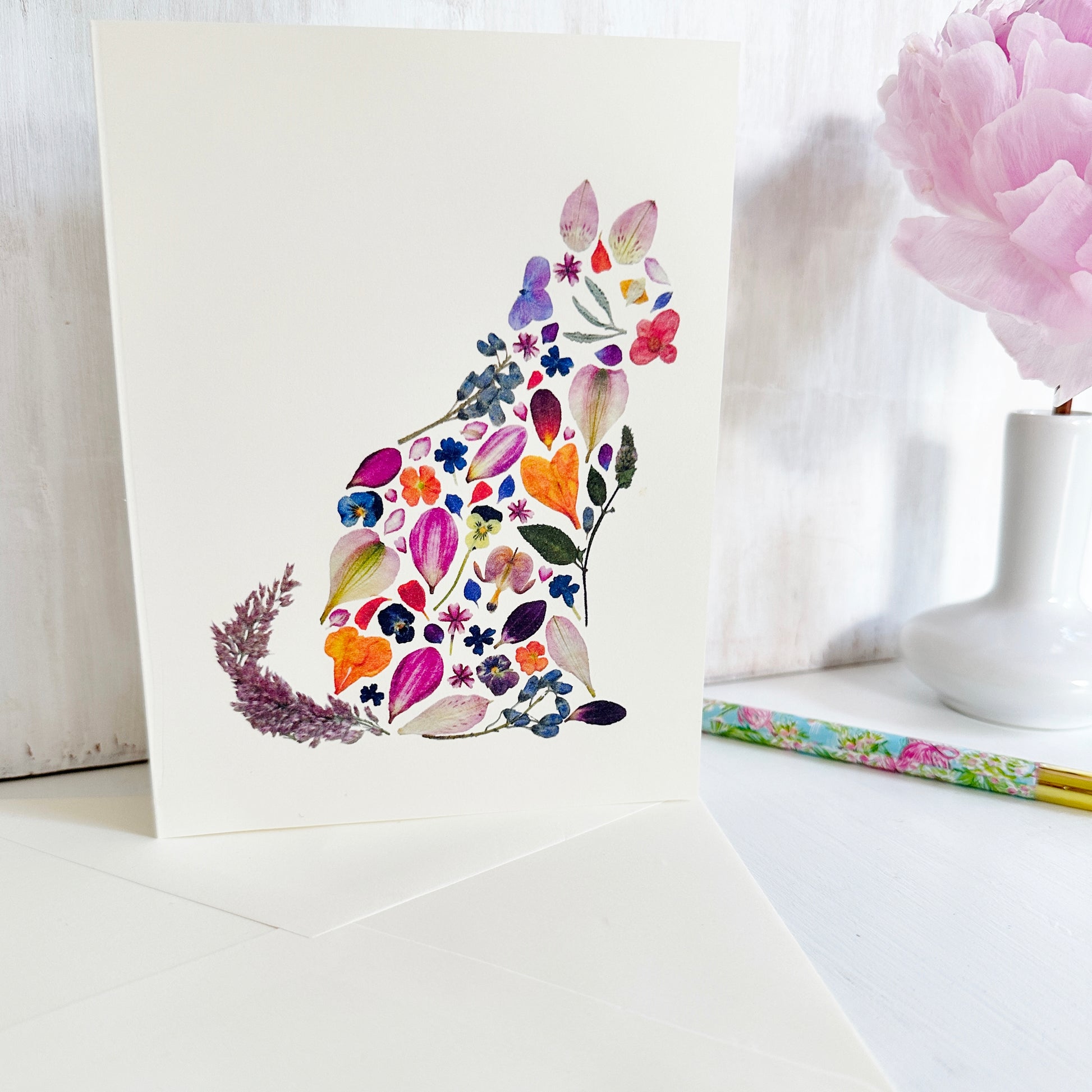 This greeting card is a print of my original collage "Botanical Cat" made with pressed flowers and leaves grown in Princeton, NJ. The flowers include alstroemeria, begonia, bleeding heart, dahlia, hydrangea, larkspur, lavender, marigold, mint, verbena, viola, and wisteria.