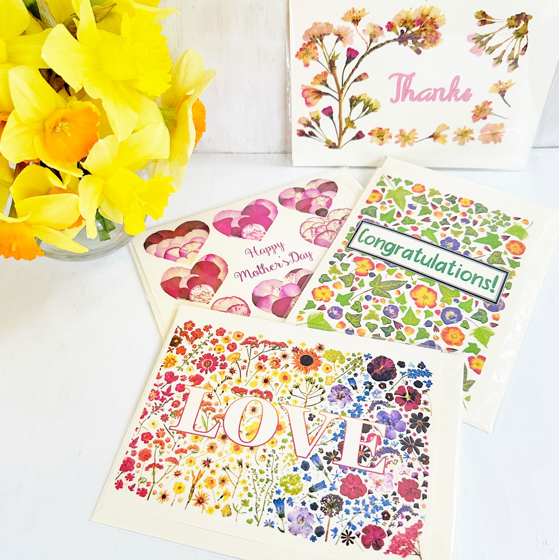 No preservative or dye were used in the original collage. The colors of the flowers on the printed card are the original colors.