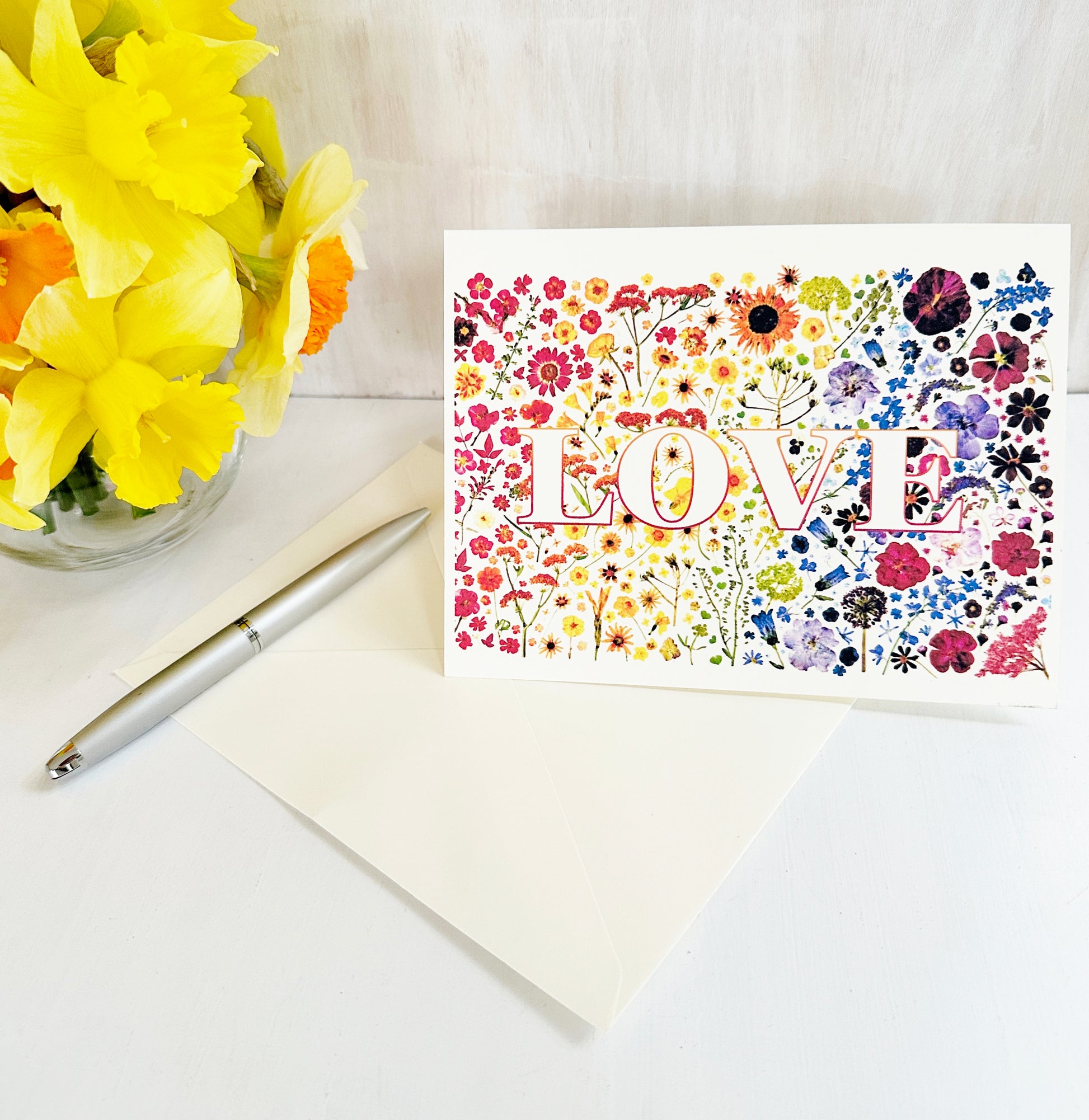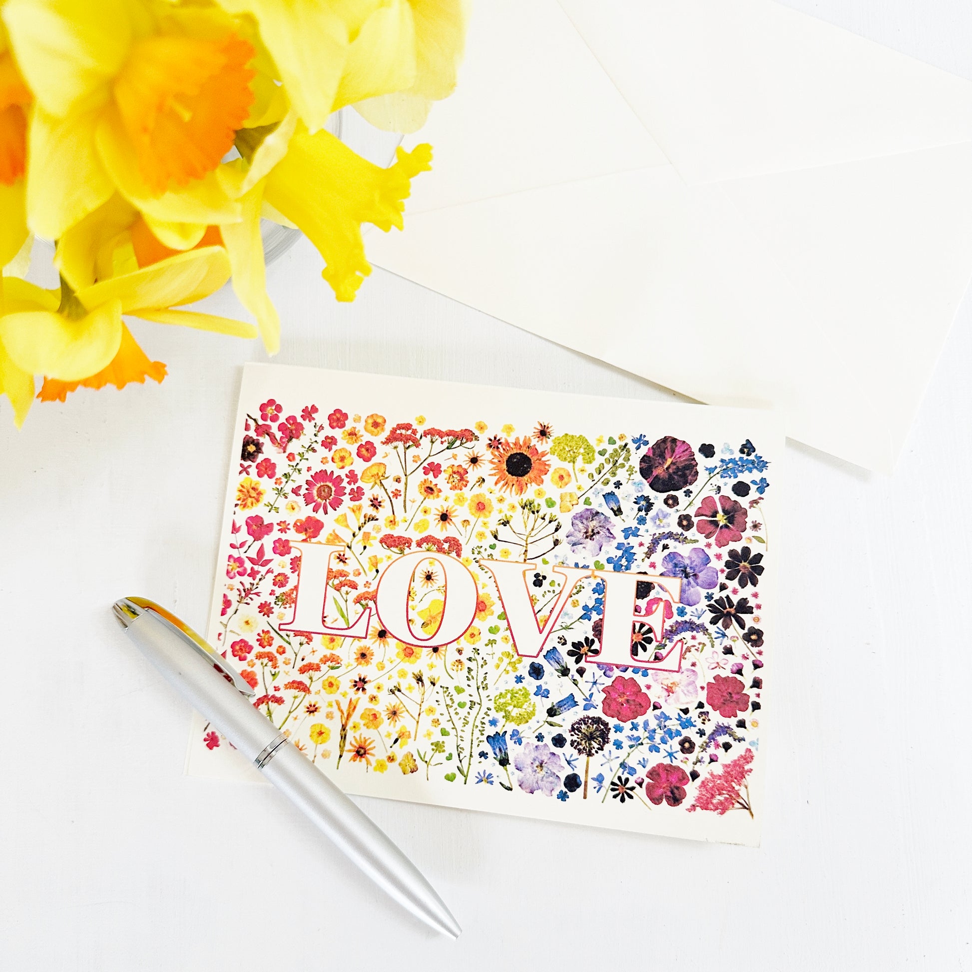 One printed 5 x 7 folded greeting card and envelope saying LOVE