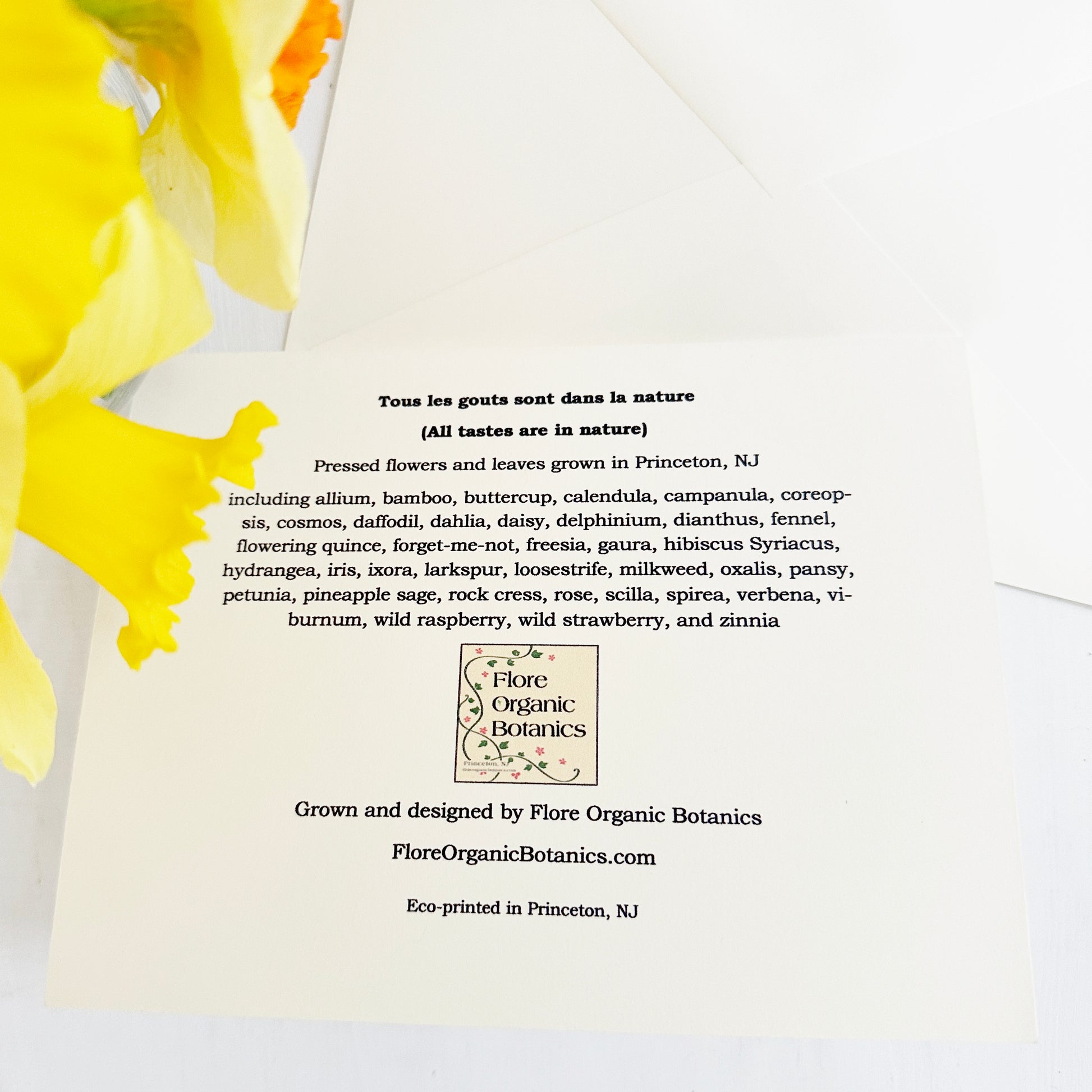 This greeting card is a print of the original collage "All Tastes Are in Nature" exhibited in September 2023 at the art show "Botanical Princeton". The flowers were all grown organically in my Garden State garden.