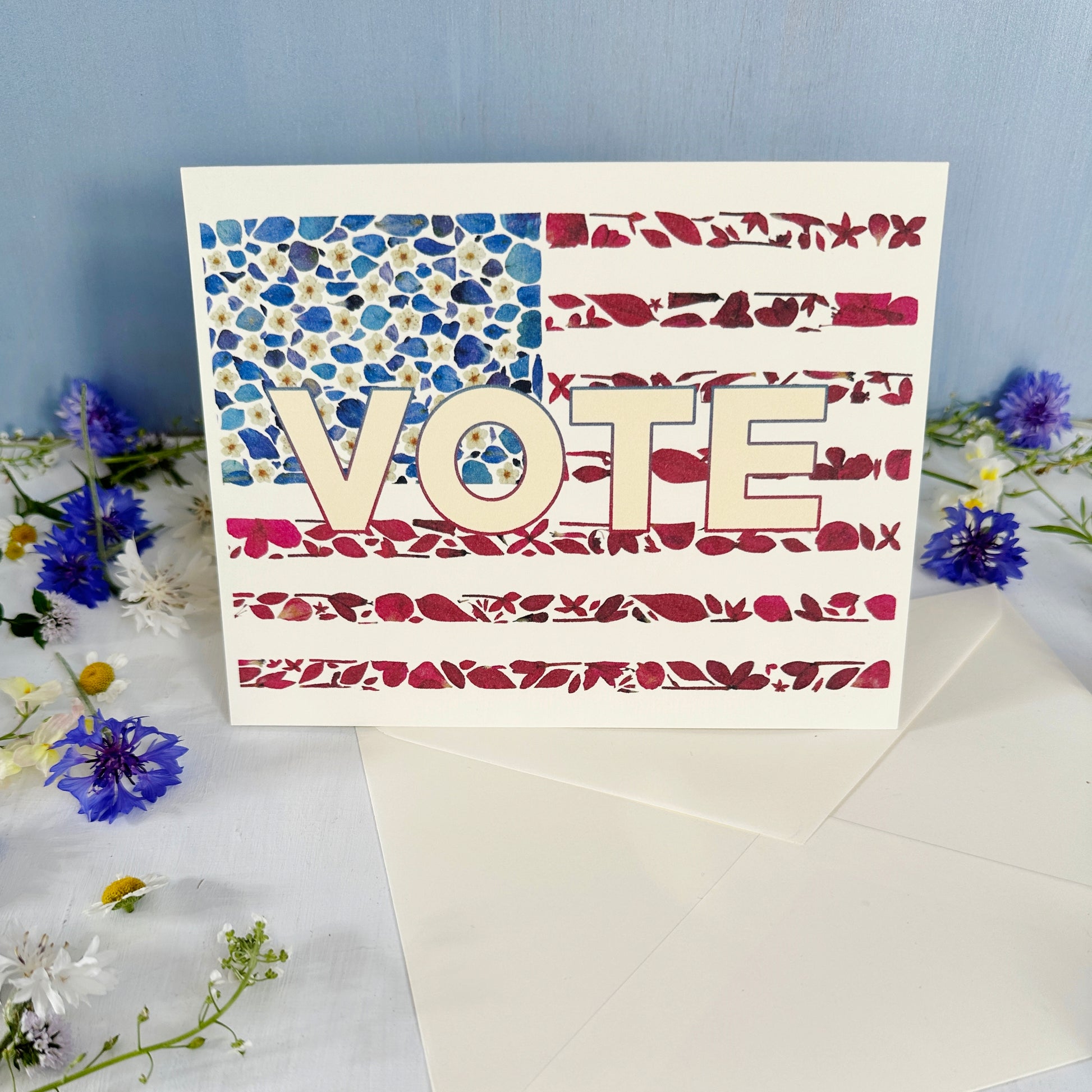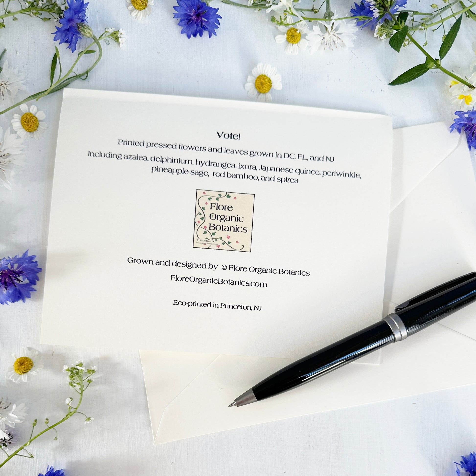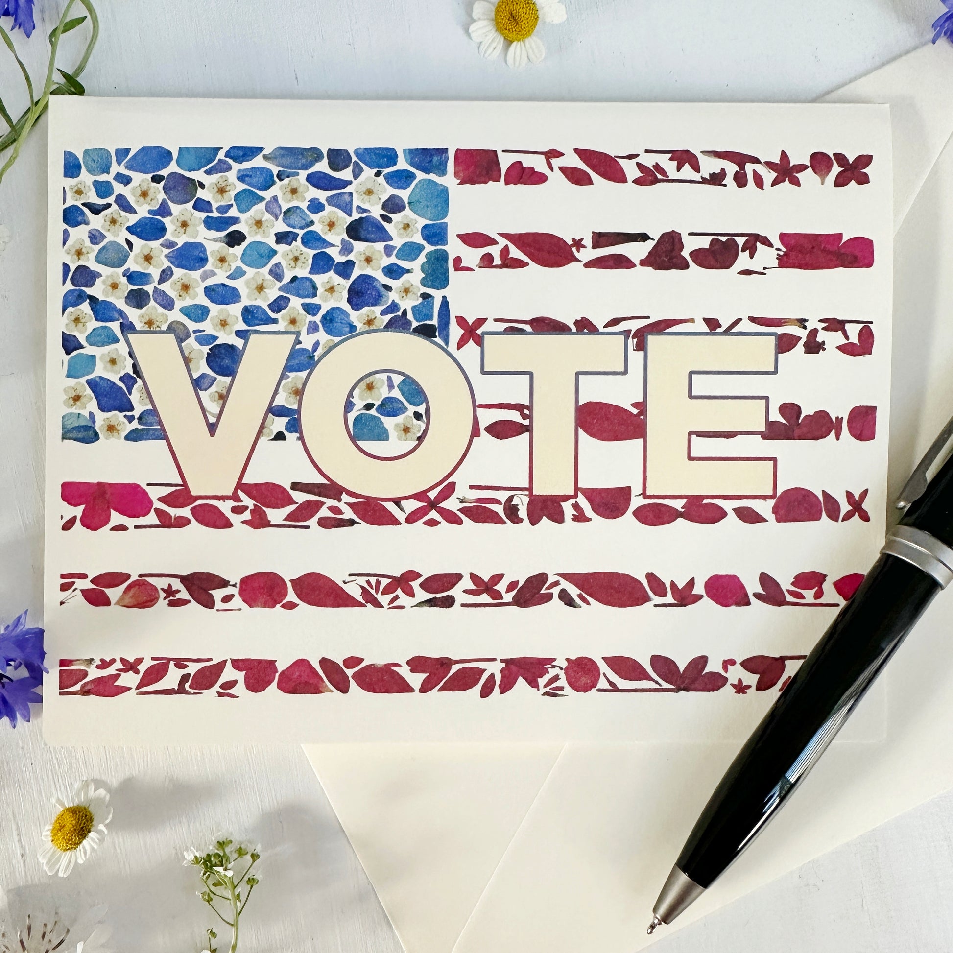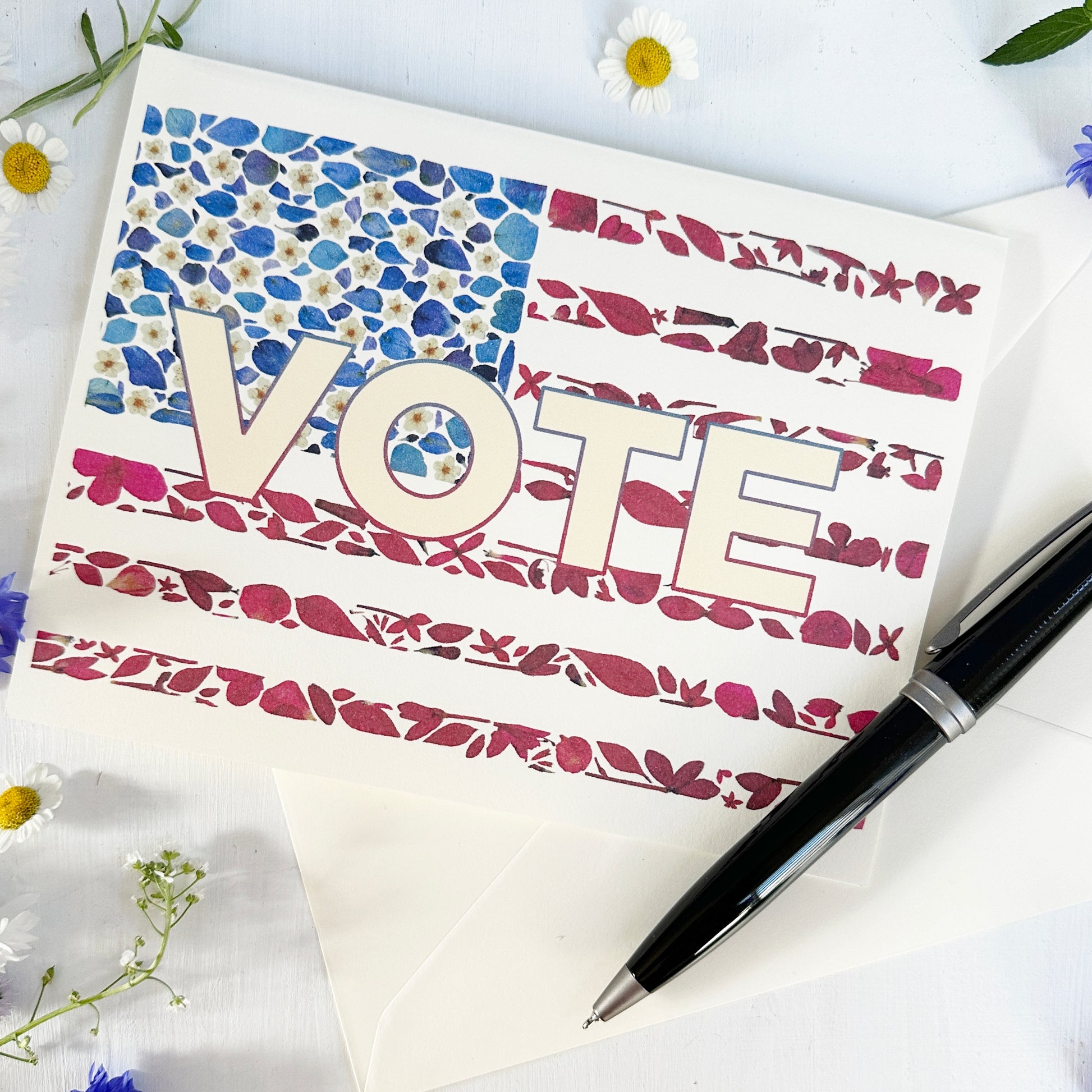 One printed 5 x 7 folded greeting card and envelope saying VOTE