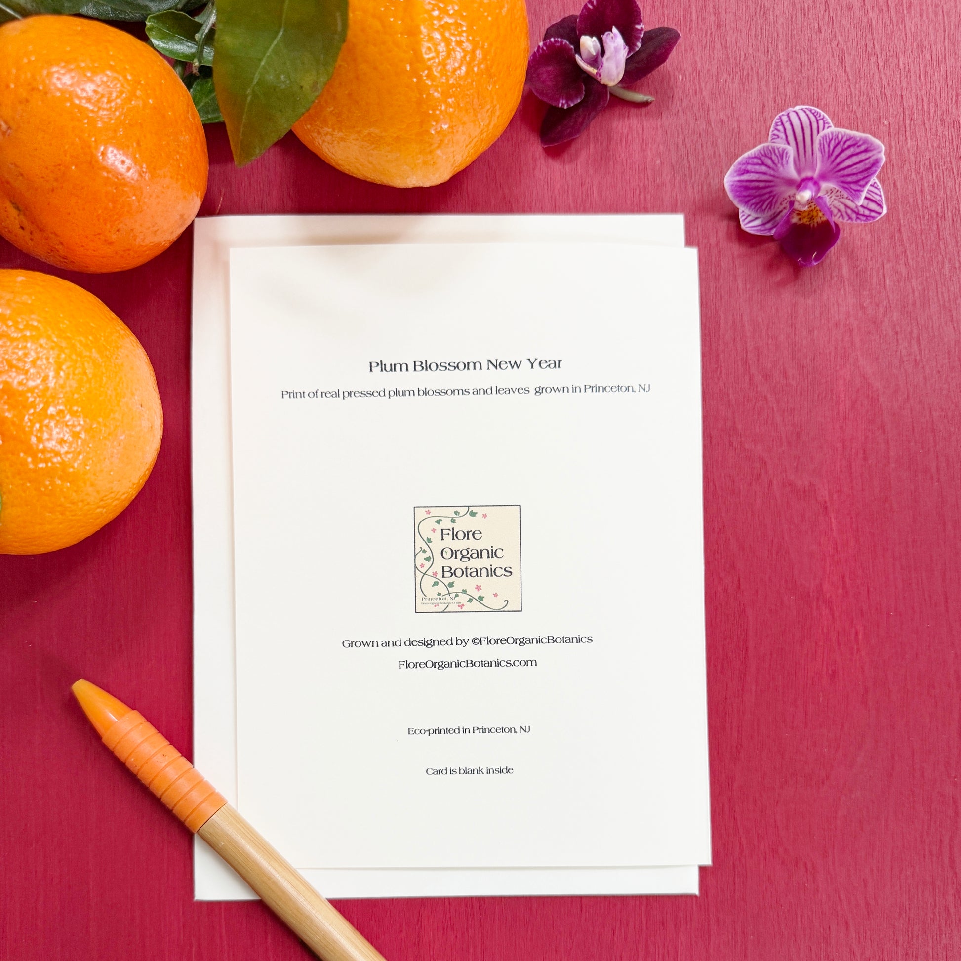 Celebrate the Chinese New Year with this one-of-a-kind greeting card featuring a print of my original pressed flower collage, "Plum Blossoms." Delicate blooms in shades of pink, coral, and cream cascade across the card, each one grown and pressed from my Princeton, NJ garden.